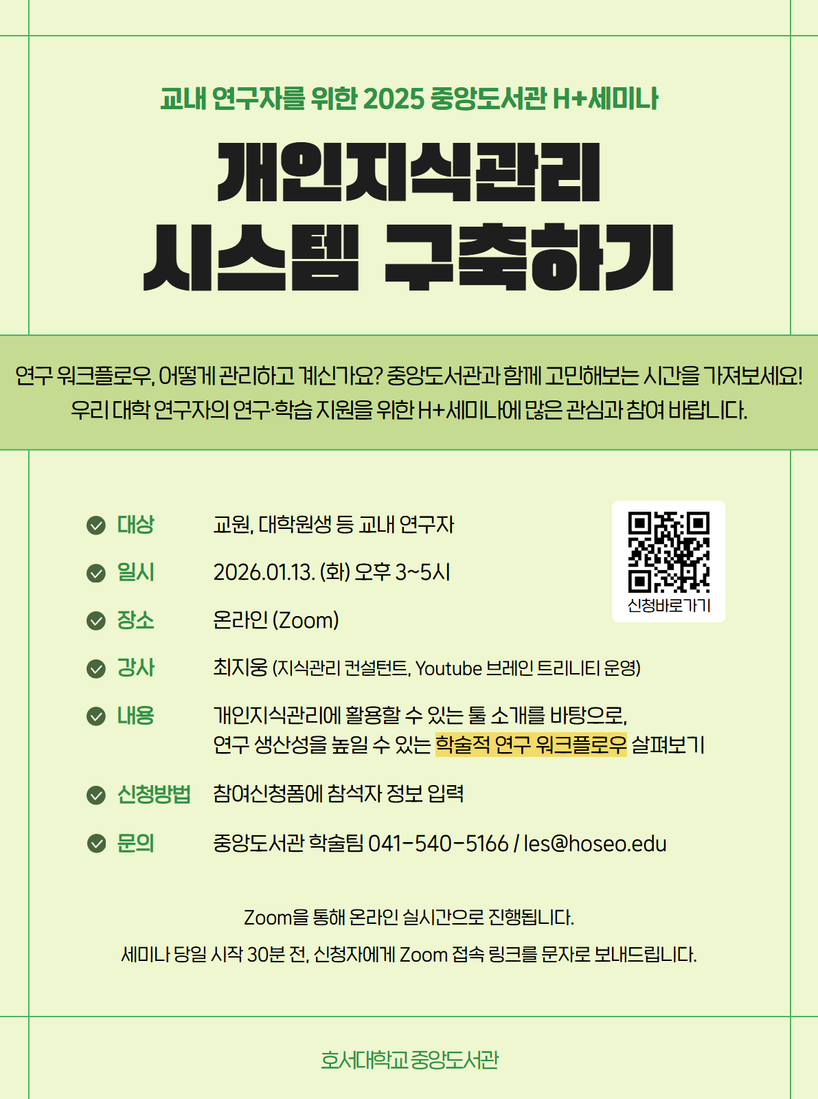 2025학년도 동계방학 중앙도서관 H+세미나가 진행됩니다. 많은 관심과 참여 바랍니다. ▶ 일시 : 2026.01.13. (화) 15:00~16:50 ▶ 장소 : Zoom (온라인 실시간) ▶ 주제 : 개인지식관리 시스템 구축하기 ▶ 강사 : 최지웅 (지식관리 컨설턴트, Youtube 채널 '브레인 트리니티' 운영) ▶ 신청 바로가기 (※ 신청하신 분들께 세미나 당일 문자로 Zoom 접속 링크를 전달드립니다.) ▶ 문의 : 학술정보서비스실 041-540-5166 / les@hoseo.edu